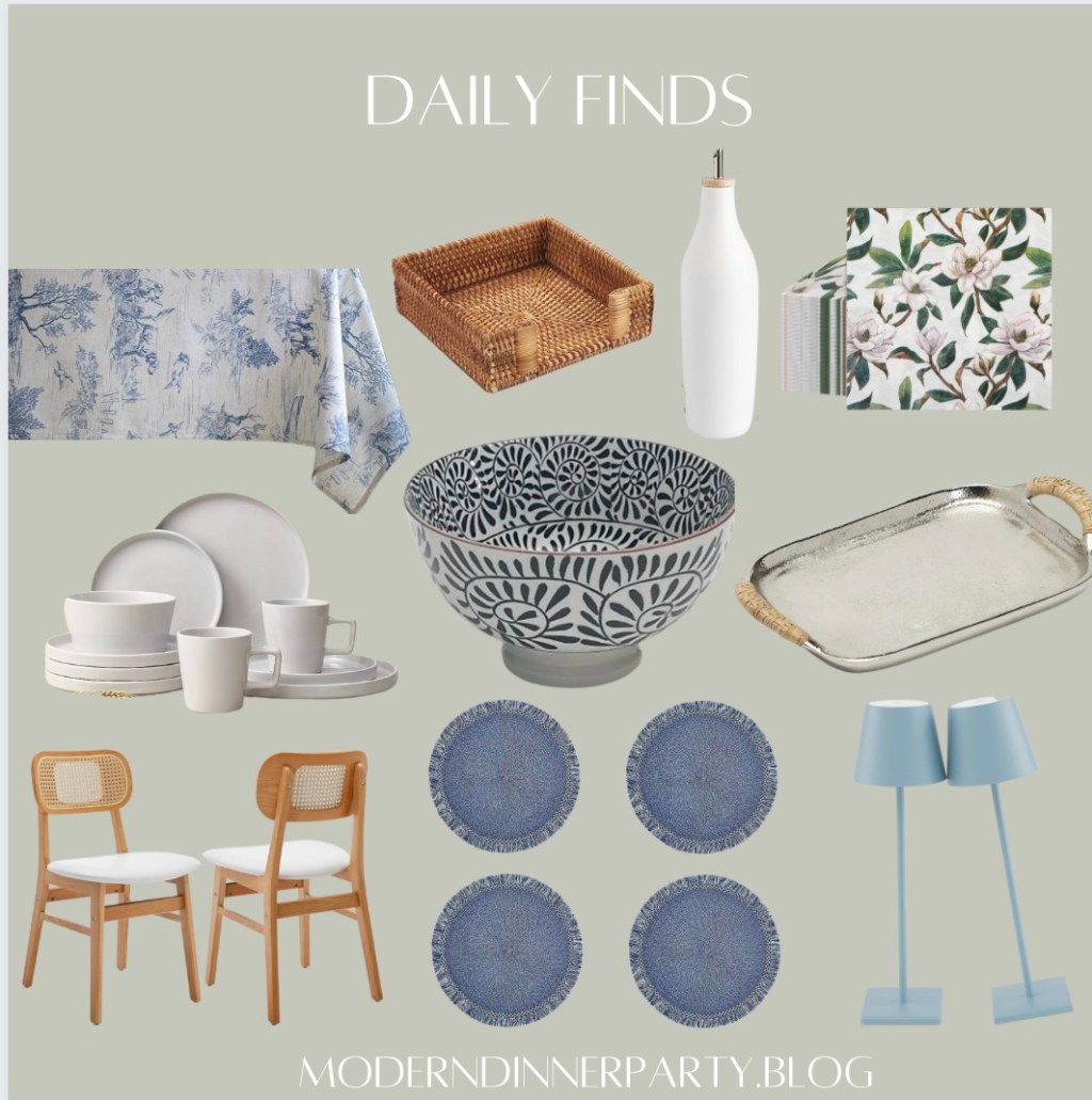 Today’s round up most resembles my everyday table. A pretty blue tablecloth (but most nights not), and then just everyday items but make them pretty. If you are looking for a bit of a refresh with a modern traditional vibe, enjoy these picks!