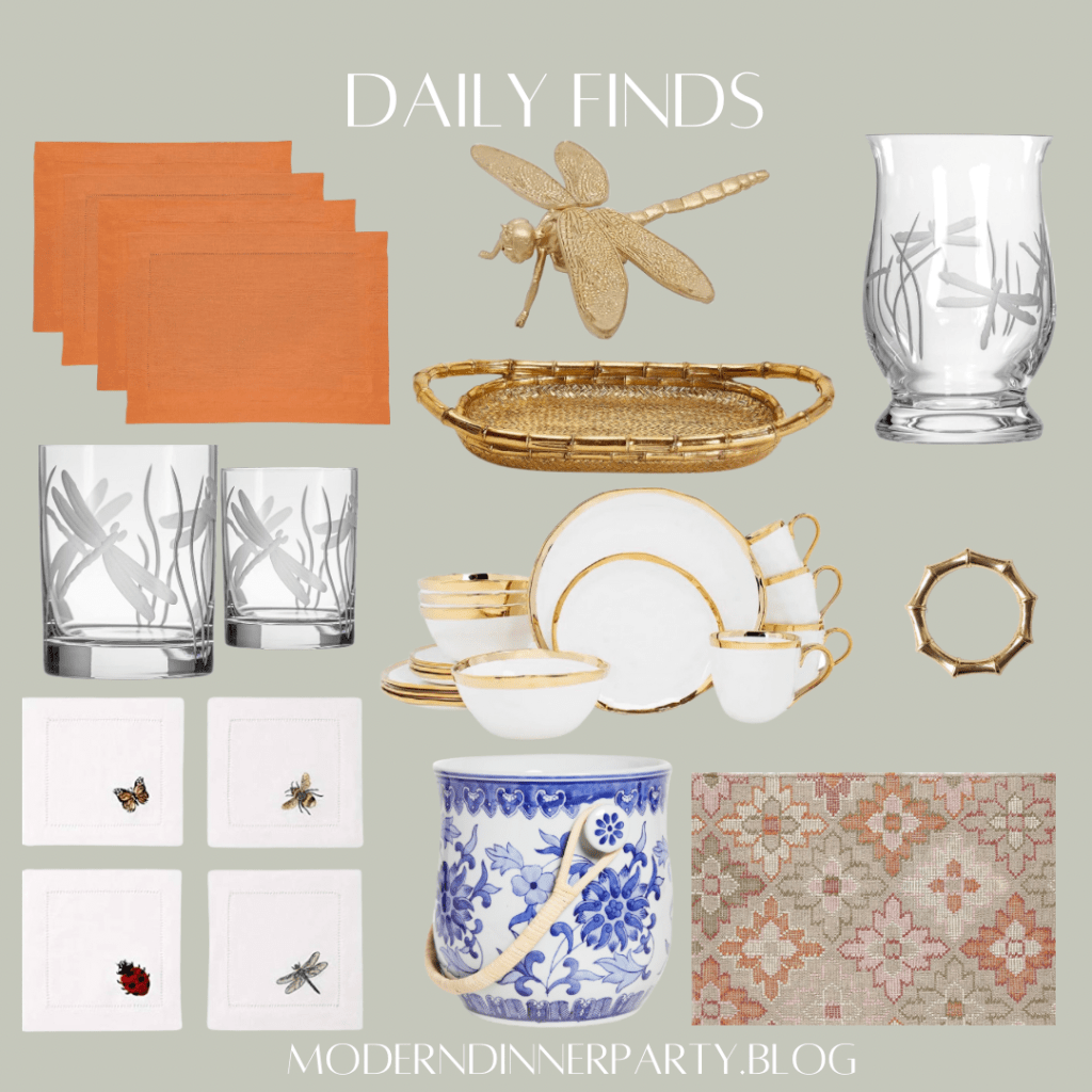 I came across the golden dragonfly, and was so drawn to it that I planned a table featuring this beautiful flying friend. Does this ever happen to you? Inspiration comes from the strangest places sometimes. Today’s round up includes some pretty finds for your table on this theme, or to incorporate into your everyday. I think the golden dragonfly, and a friend or two, would look so pretty on your table as a centerpiece. Enjoy!