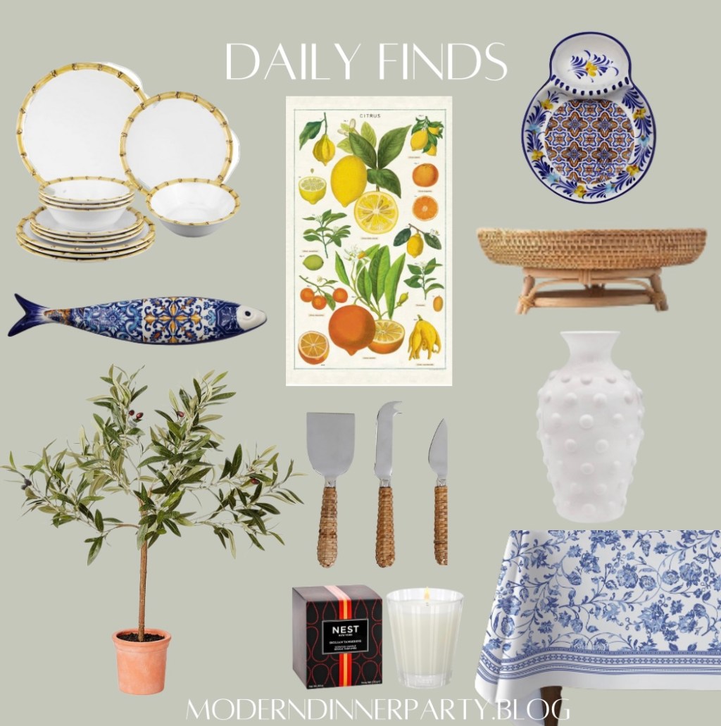Yes, I know it’s fall and I’m supposed to be wearing sweaters and picking apples, and I crave those things, too, but there’s something special about visiting tourist destinations in the off season, like a long ago trip. My picks today reflect this feeling I’m chasing—the olive tree, Portuguese ceramics, citrus are enough to keep fall away for a bit without feeling too out of season. Maybe you’re planning a fall beach gathering, or seafood’s on the menu this week, or you’ll save these picks for another day. Enjoy!