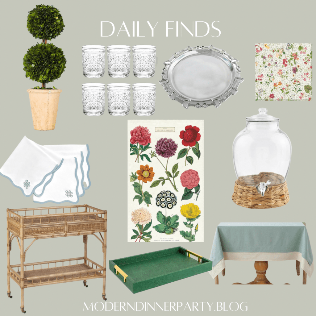 Todays round up is so much fun! I love this theme for a bridal shower or baby shower or a fun birthday. Grab two of these boxwood topiaries, pop them on your long table as centerpieces (they’re reusable this way, too, or will find another great space to live in your home). The cocktail napkins are charming, I love the dark green tray to make this work for fall, and cute glasses for cocktails of course!