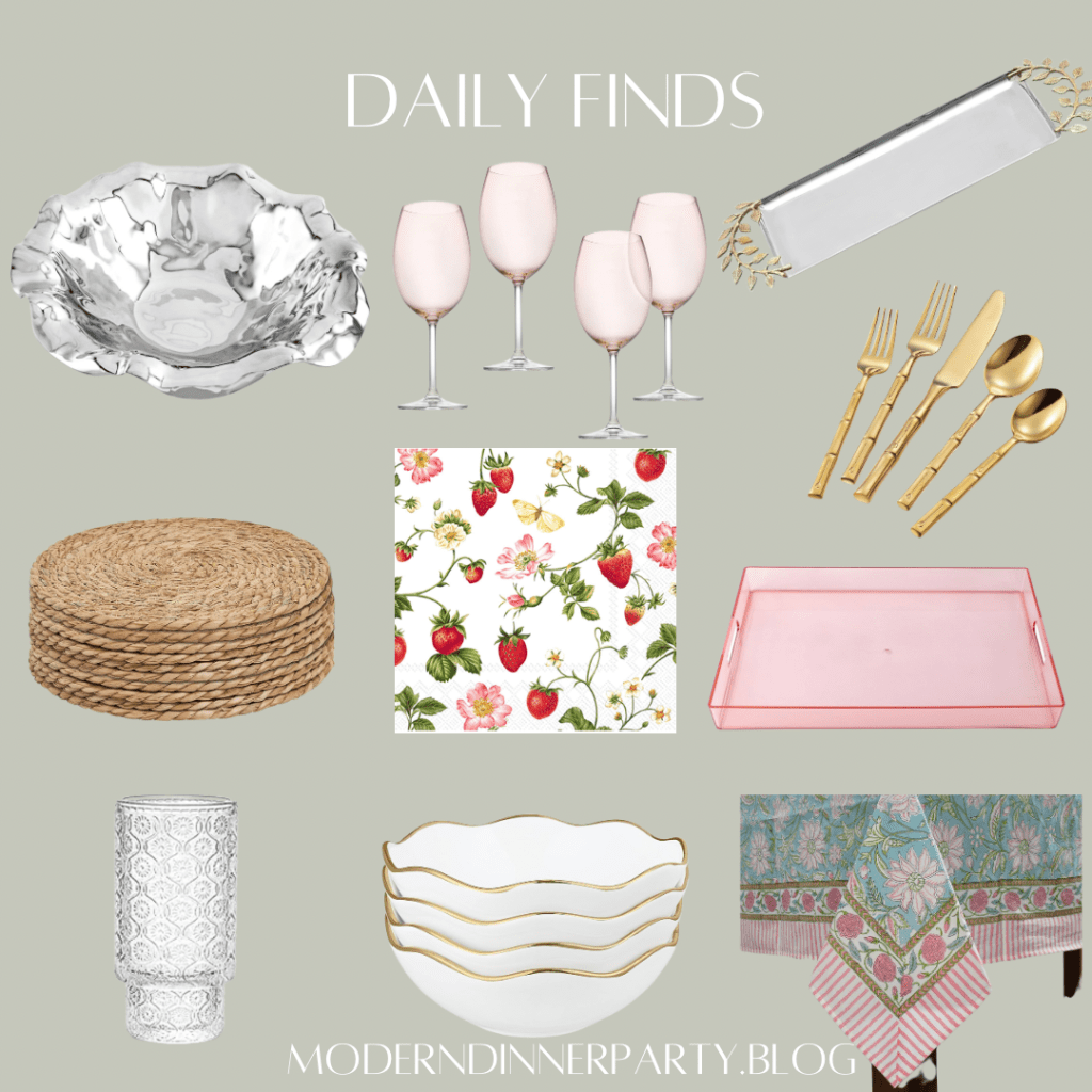 This cute strawberry blossom napkin inspired today’s tablescape! Cute for summer or really any time of year. I love this girly tablecloth and pink translucent tray, and I recently bought a few sets of these glasses for a baby shower!