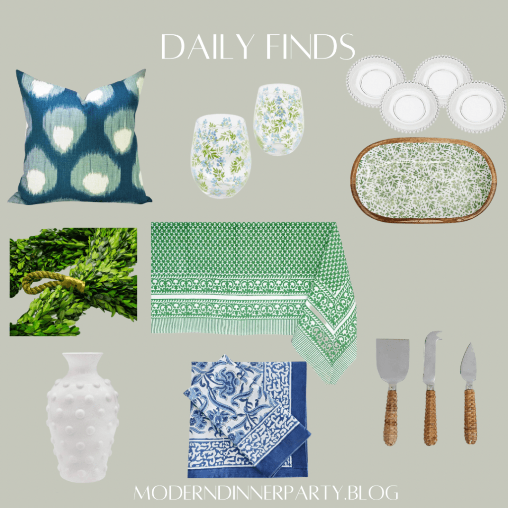 We love this green and blue tablescape—add fresh greenery or this great boxwood garland. This is a great tablecloth that can be used for football games, spring time parties and more!