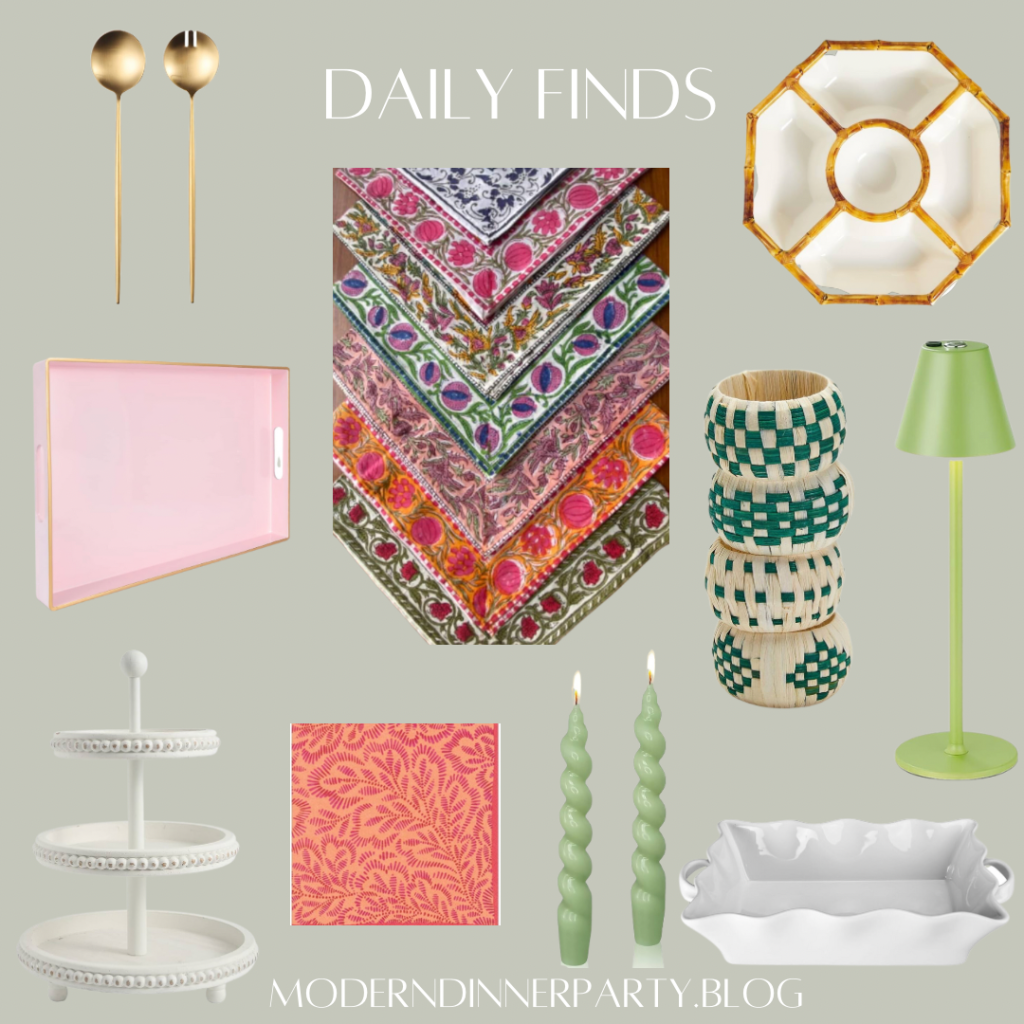 I love color and all things block print, so today I’m sharing tablescape inspired by this set of mixed napkins. A set like this is a real staple—you can pull out the color stories you need for smaller dinners, and the options give you a lot of room to play with in terms of other items you can pull into your tablescape. I especially love this green cordless lamp and the napkin rings!