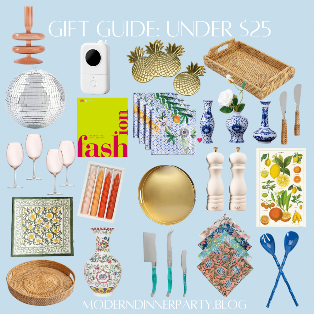 Day Two of $25 and under Gift Guides for the 2023 holiday season! Todays round up includes some pretty tabletop finds and practical items, like a label maker I have and love, a fresh pair of salt and pepper grinders, beautiful cheese knives in a fun color, and adorable brass pineapple coasters. I’ve stashed away many of these items as gifts this year, like cute napkin sets and sturdy, inexpensive trays—which I found useful to have post partum for drinks, bottles etc. The high school or college student in your life would be delighted my this disco ball, and I know I’d love this $15 enamel bud vase.