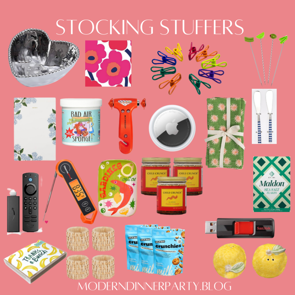 This gift guide is all about stocking stuffers! I love stocking stuffers—small, random things that bring delight. We tend to do a mix of stocking folks up with things they need (toothpaste, nice body wash, etc.), candy and fruit, and interesting or helpful small items. A few picks I’ve pulled for you—car window smashers for emergencies, AirTags, cute cocktail napkins obvi, Amazon fire stick, cute bag clips and more!