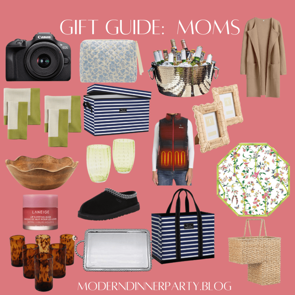 Shopping for a mom of young kids? Here are some sure fire hits. Pretty glasses and silver trays to feel pulled together, a nice camera to remember the good times, party tubs and heated vests for soccer games, and all the Scout bags to get organized!