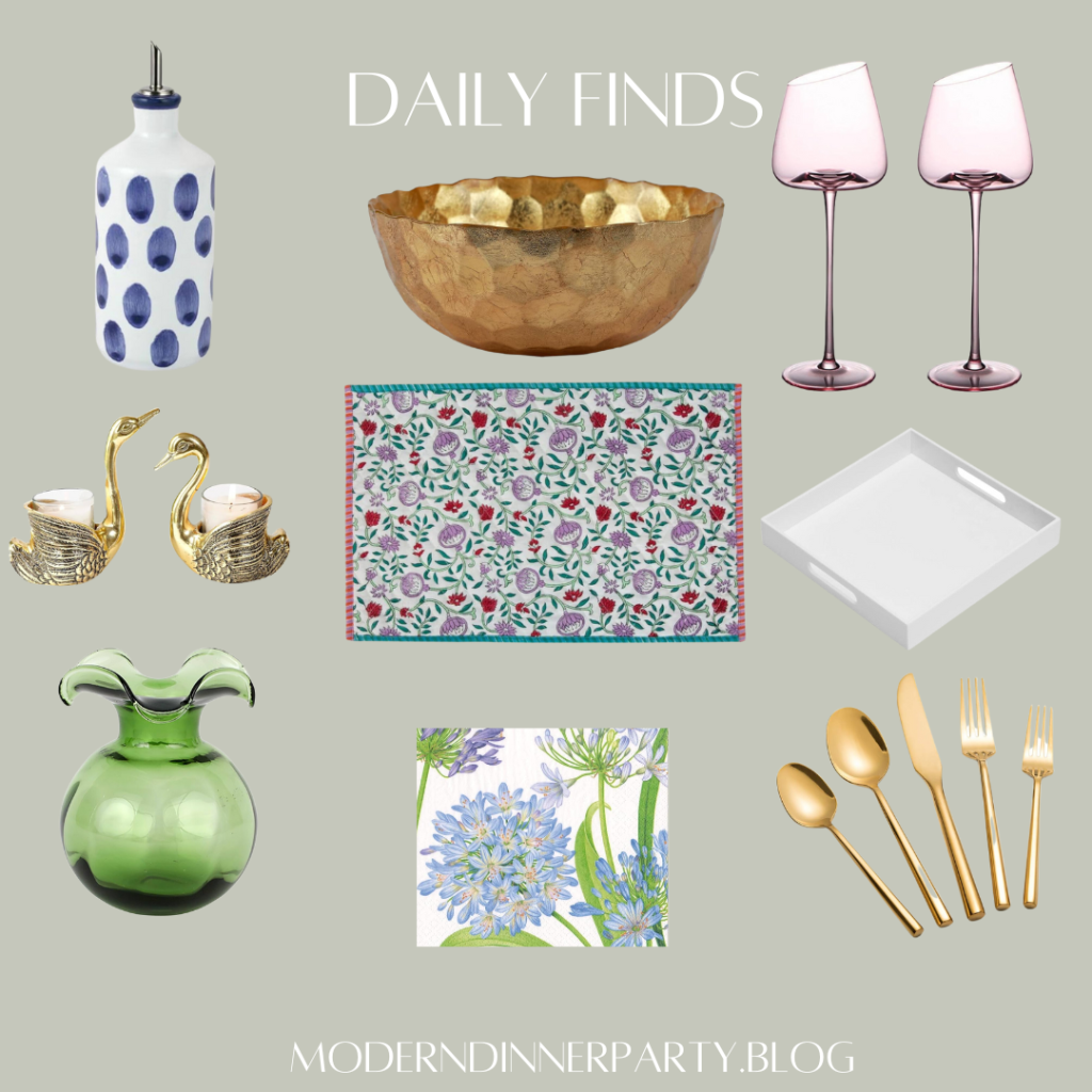 Sharing nine beautiful items to elevate your kitchen! I love all things Vietri, and know their pieces to be great quality—I especially love this olive oil cruet to dress up your kitchen counter! And what fun pink wine glasses with such a unique shape.
