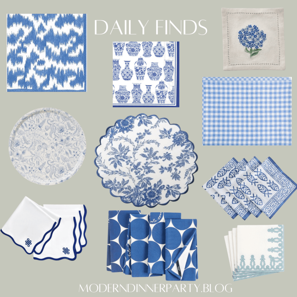 Rounding up an assortment of paper napkins, cloth placemats, cocktail napkins etc. of the blue and white variety!