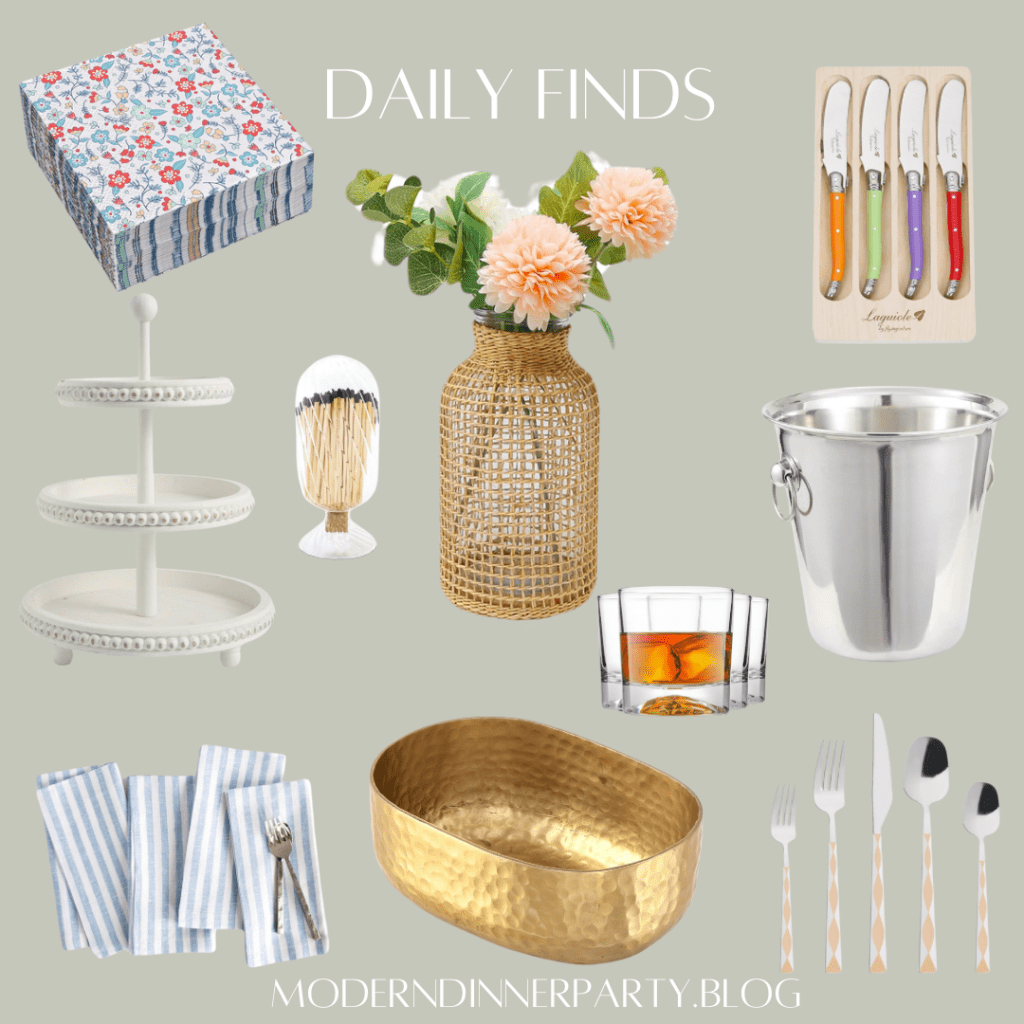 Throw together a casual get together with this chic gold drink tub, funky silverware, casual but classic striped napkins, pretty dainty and inexpensive cocktail napkins and more!