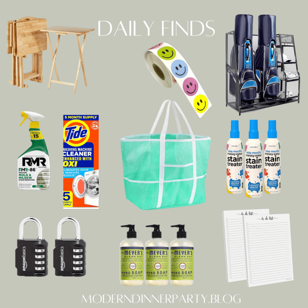 Time to share a random assortment of recent Amazon purchases! We love these reasonable tv trays, this mold and mildew spray is awesome for outdoor furniture and Miss Messy Mouth is the GOAT for kid stains. Less obvious, I purchase this golf bag rack to house my vacuums in the garage—they fit well, the stand can hold the accessories, keep everything off the floor and look nice! I like for everything to have a place, and this helps. This mesh bag fold up very small and is perfect for beach toys.