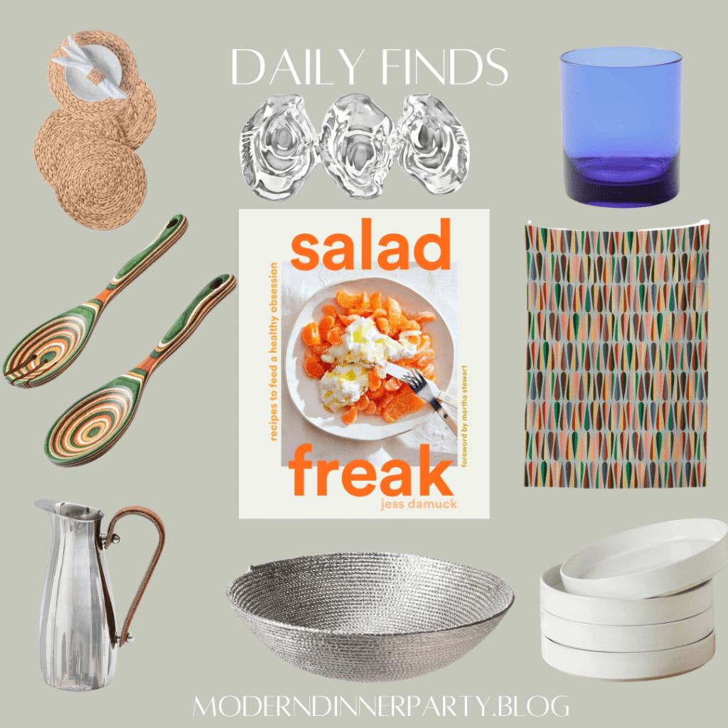 Salad Freak is a fantastic cookbook, especially in the summer, and great for entertaining. I’ve rounded up some beautiful and sort of funky tablewares to set the tone. This silver bowl is stunning, as is the color of these melamine glasses!