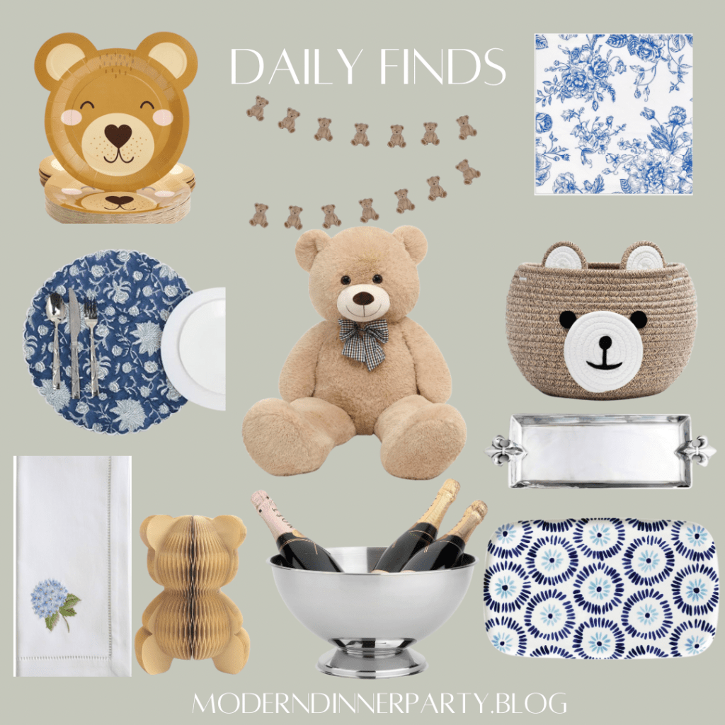 Mix sweet blue and white serving pieces with neutral bear decor for a simple but pretty baby shower idea. I like incorporating decor that the mom can use later, and reusing my own pieces as much as possible!