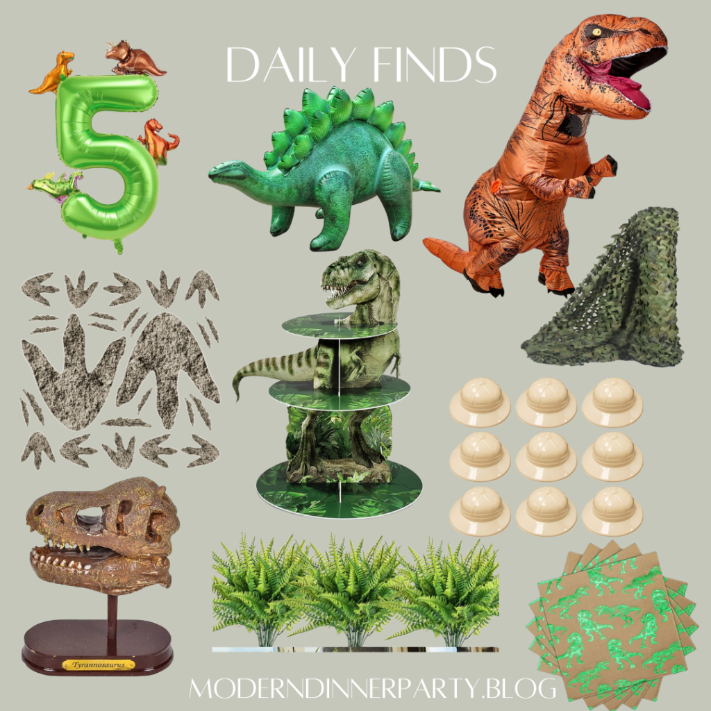 Throwing a Dino-themed party any time soon? If you’re going for Jurassic Park Vibes, I got you. Set the scene with foot print floor stickers, faux greenery and camo netting. A T.Rex costume is a must have. Suit up your little guests with paleontologist hats, a few activities and some sugar and they’ll be all set!