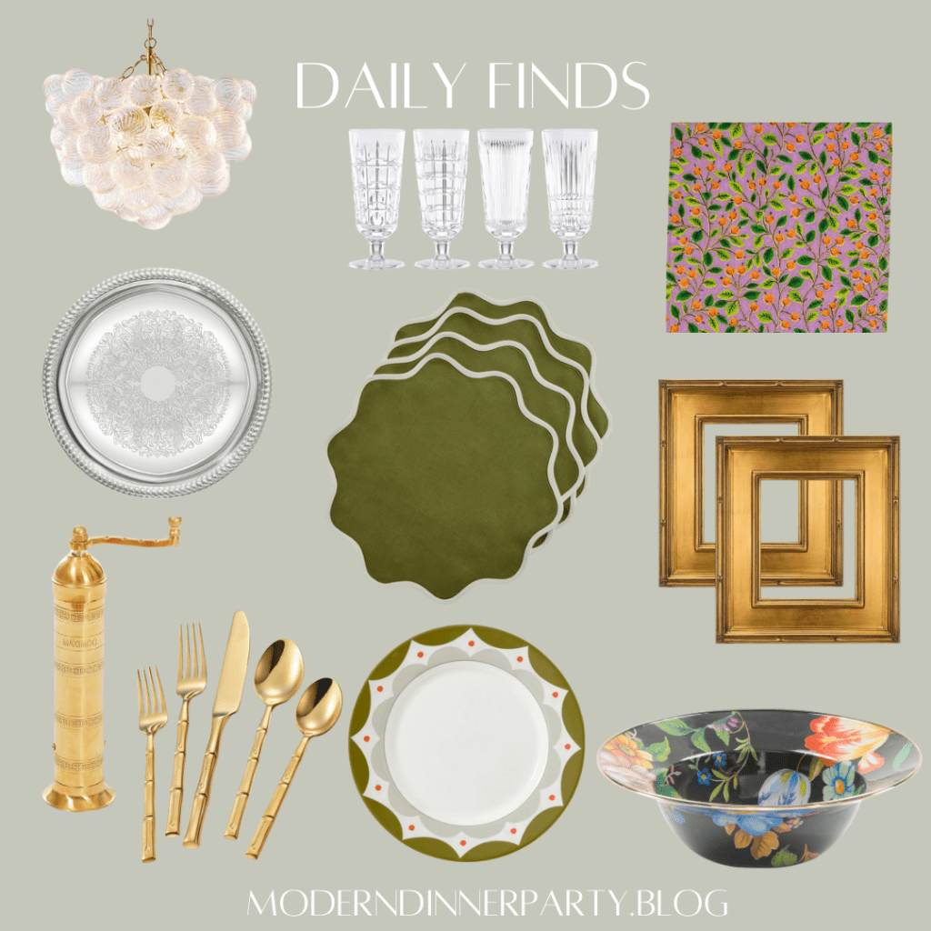 This classy and updated dining room set up with a bubble chandelier, gold flatware and deep greens and purple is a stunner!