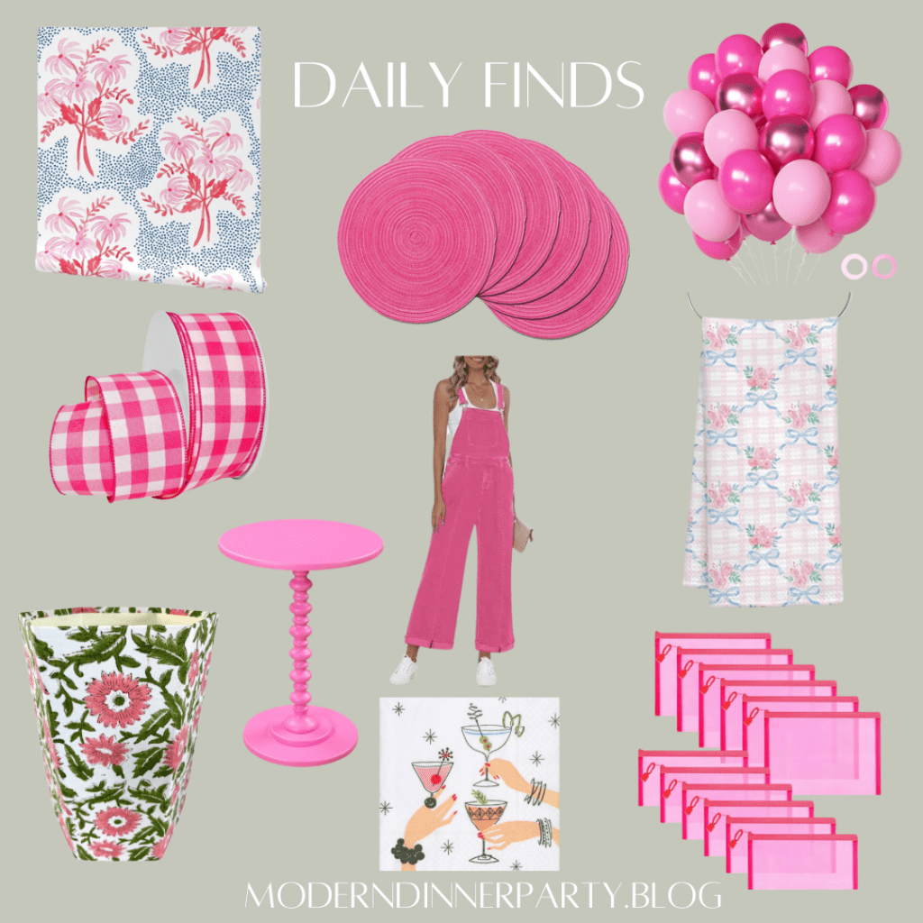 Pretty in pink, as they say! Some cute finds in a favorite hue—mesh bags to organize, adorable overalls for gardening and of course some preppy tabletop finds!