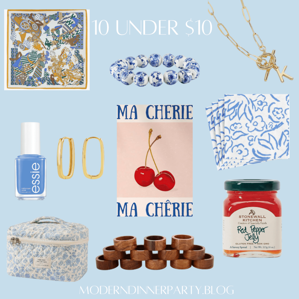 I love this shade of French blue—it feels happy and hopeful. Today’s 10 finds under $10 should cheer you right up if you add to cart—pretty blue polish, adorable make up bag, some staple wooden napkin rings, a favorite pepper jelly and more!