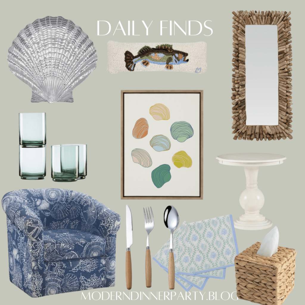 How fun is this chair! And this artwork! Coastal finds that add detail and make a statement. The fish pillow & shell platter make great gifts, too.
