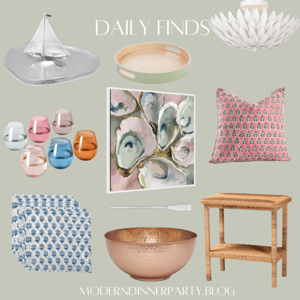 This has gotta be one of my favorite round ups! The oyster art is so chic and pairs so well with these colorful wine glasses, copper bowl and pillows. Great transitional coastal look!